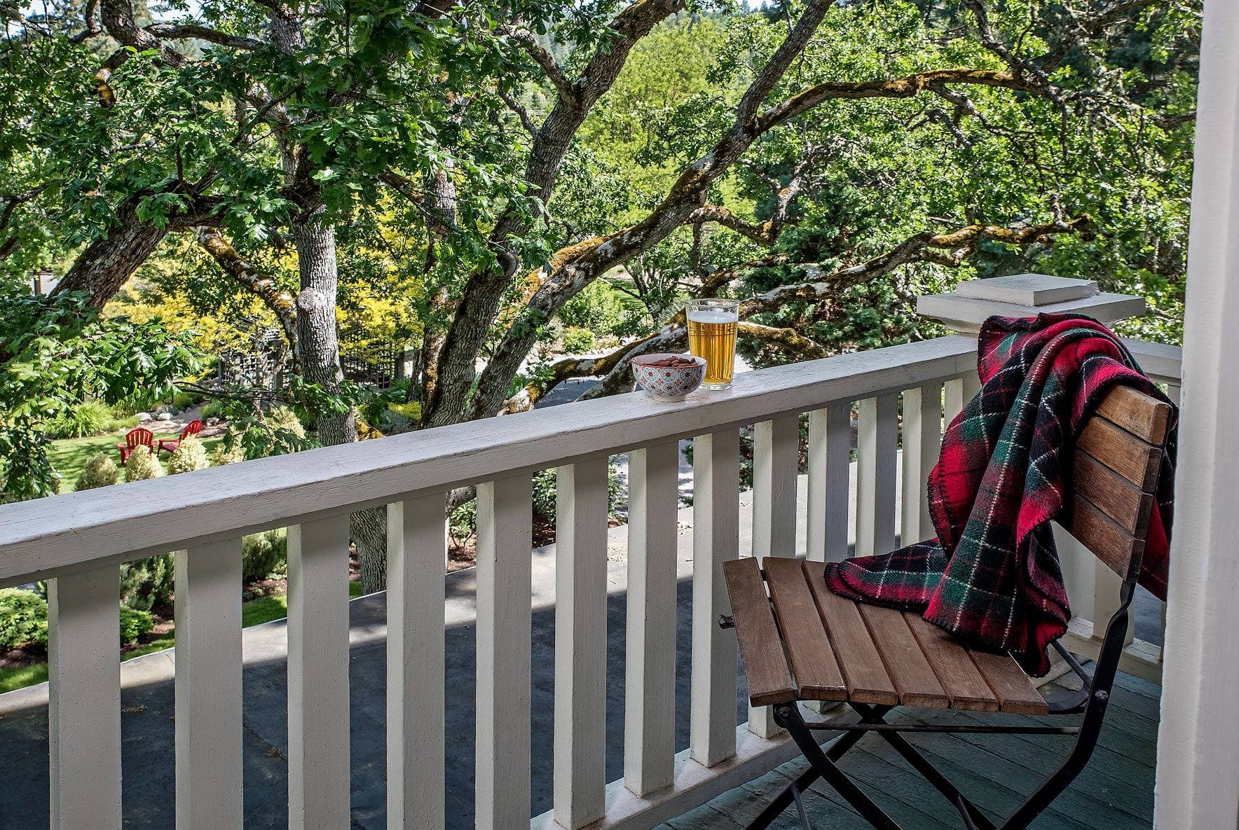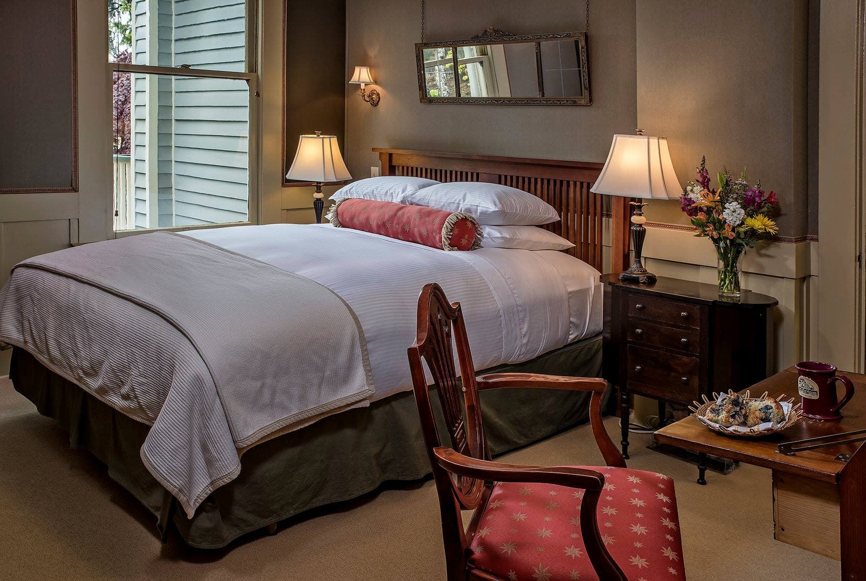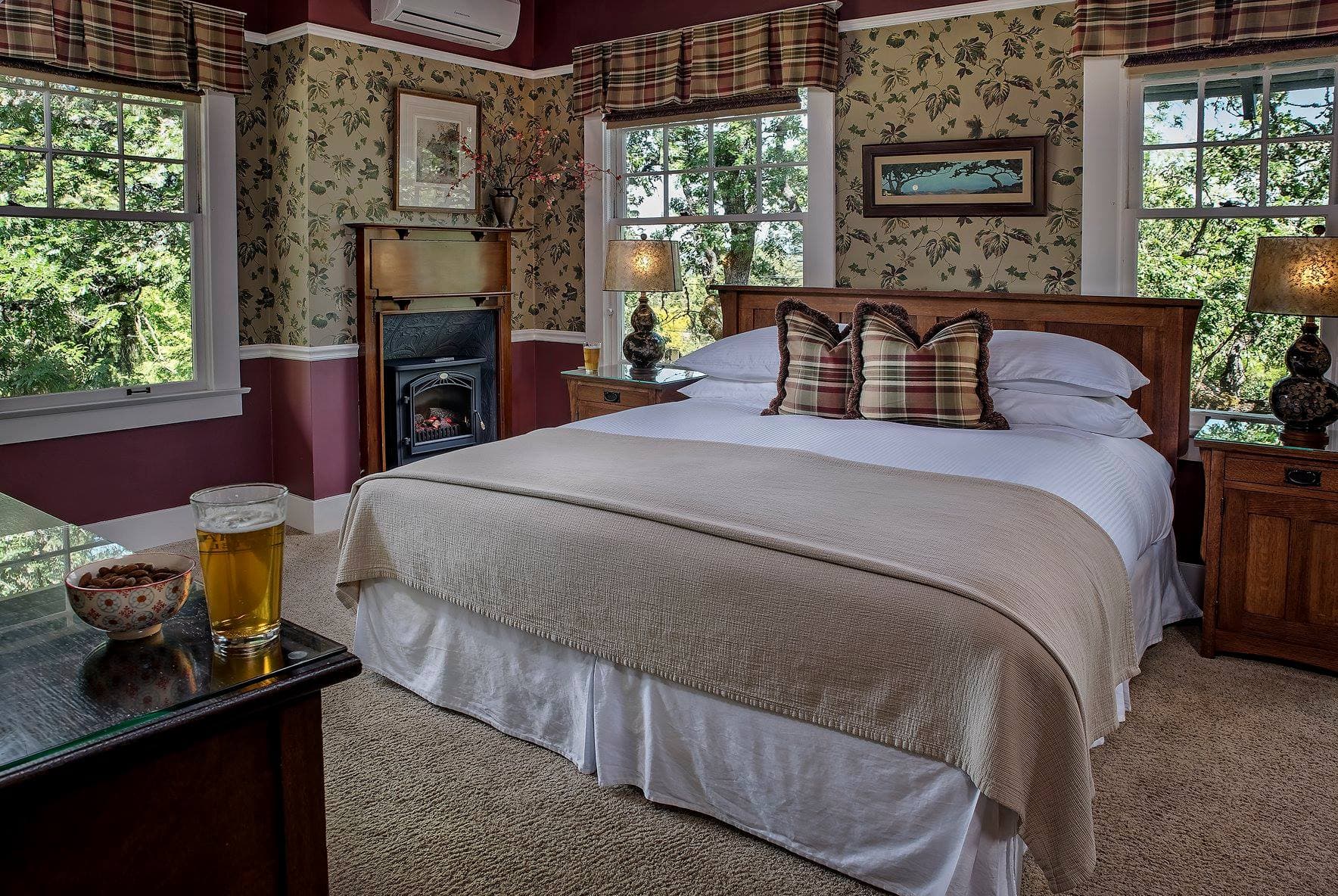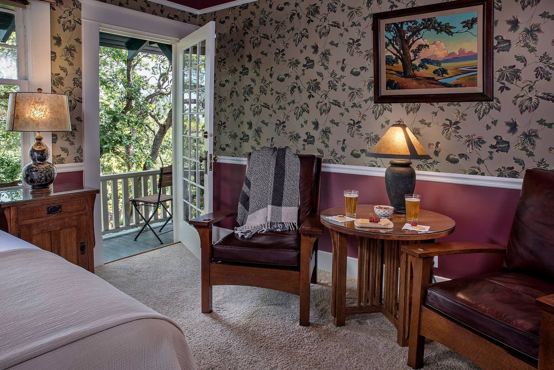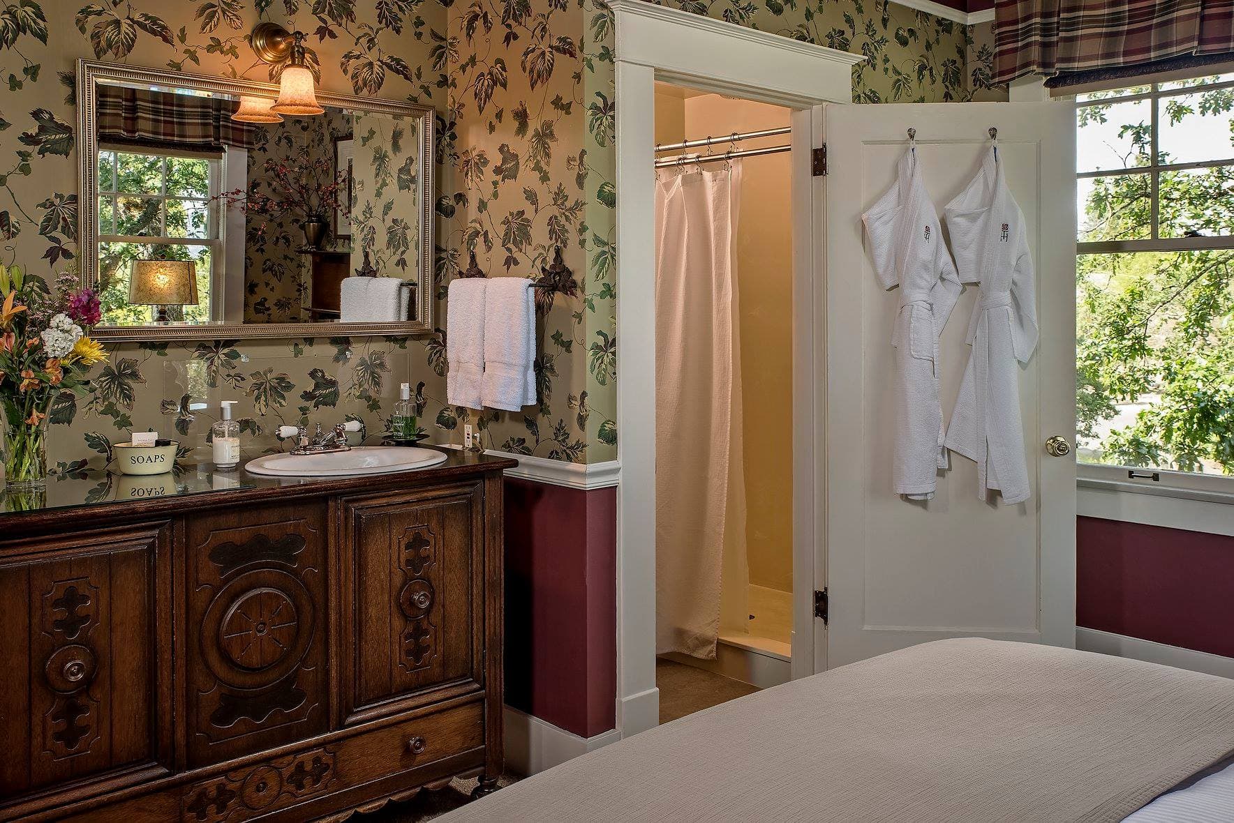 One of our loveliest rooms, Heritage Oak, on the second floor, features a King sized bed with featherbed topper, fireplace, study table and chairs, small sitting balcony within the boughs of our heritage oak tree, antiquarian wallpaper, cascade shower large enough for two, and equipped with a dedicated minisplit heating/air-conditioning unit. There is a self-serve coffee /water bar just adjacent to this room. Front windows overlook the front terraces and yard while a side window offers views of our heritage barn and pool terrace. Very romantic!